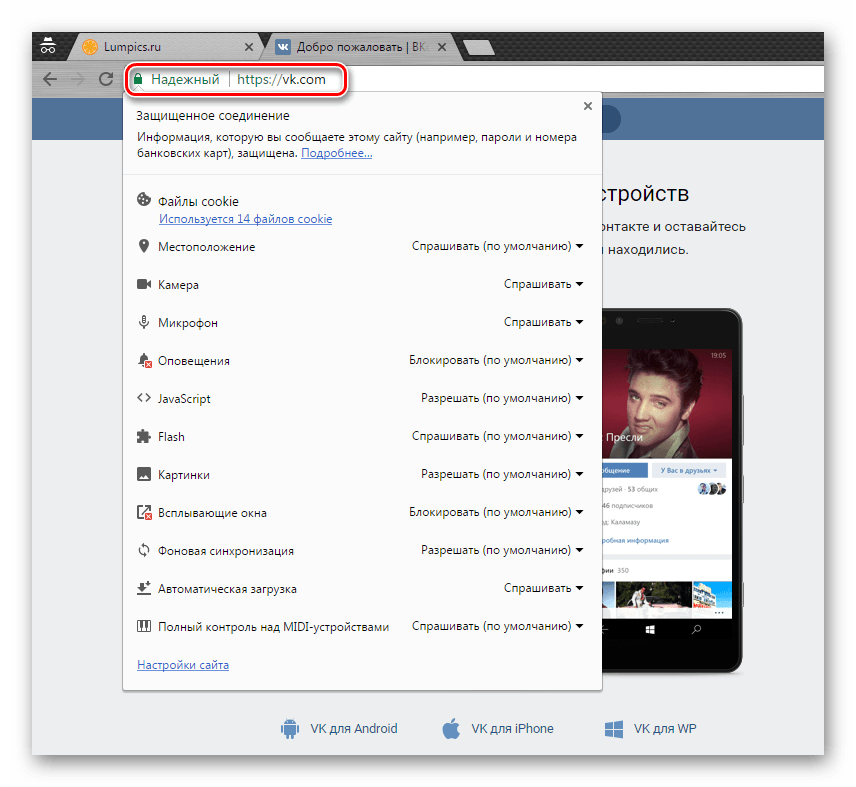 Посмотреть, используется ли HTTPS, можно нажав на значок слева от адреса сайта. Если там изображена пиктограмма замка и слово «Защищено», то ресурс передает трафик по протоколу HTTPS, для примера, одна из самых популярных социальных сетей — «Вконтакте».
