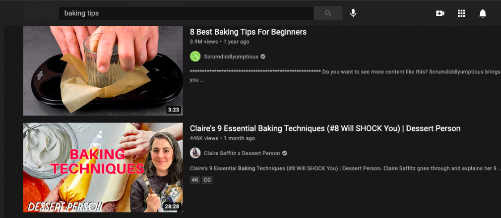 Возможно, поэтому в топ часто попадают короткие видео. В этом примере по запросу «baking tips» на первом месте видео с 3.9 млн просмотрами, оно длится всего три минуты. У него больше шансов быть просмотренным до конца, чем у получасового ролика.