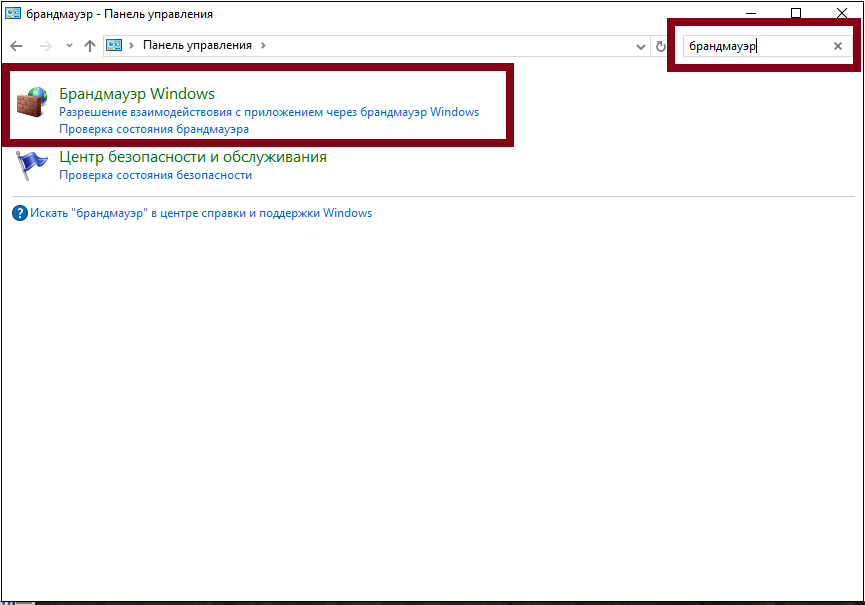 Если Вы используете встроенный Файрвол, то его, для начала, следует найти. Поэтому мы переходим в «Панель управления» и в поиск вводим «Брандмауэр».