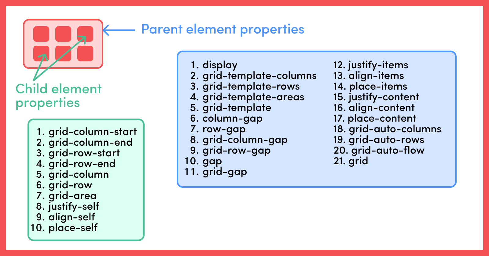 The below diagram lists down all the properties you can use for the parent and children. As CSS Grid is a huge topic in itself, it’s not in the scope of this article to discuss about each and every property. So let’s discuss the properties that we’re using in this article.
