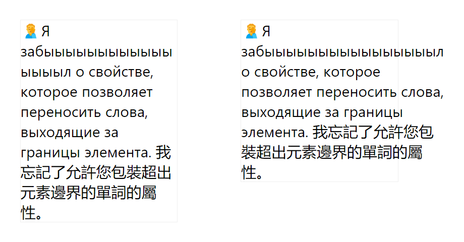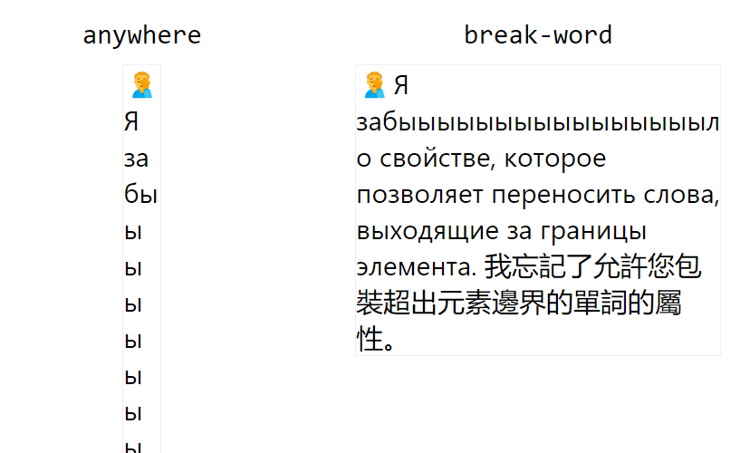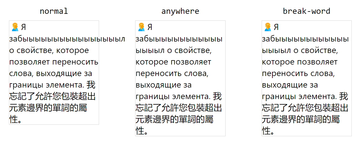 - – выполняет разрыв слова именно в том месте, в котором происходит переполнение, но только для текста не на китайском, японском и корейском языках (CJK);