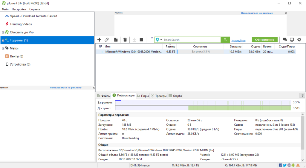 Загрузка дистрибутива началась. Клиент подключает вас к пирам и высчитывает примерное время загрузки при вашей скорости интернета.