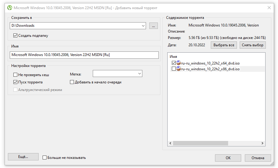 Перед вами откроется окно «Добавить новый торрент», в котором вы сможете выбрать необходимый дистрибутив уже с расширением «.iso». Отметьте галочкой нужный файл и нажмите «ОК».