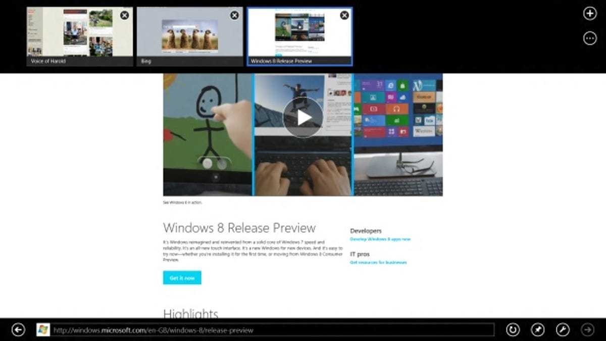 Наш обзор windows 8 предоставляет также данные о совместной работе этой системы с браузером Internet Explorer 10. IE10 запускается в Windows 8 как в интерфейсе Metro, так и на настольном варианте. Для изменения настроек – таких как подключение списка защиты от трекинга (Tracking Protection Lists) или сохранения в избранное (также выбора домашней страницы) – вам нужно щелкнуть на панели приложения и нажать появившуюся кнопку для того, чтобы страница развернулась на рабочем столе. При клике на панели также появляется адресная строка и панель с иконками открытых страниц.