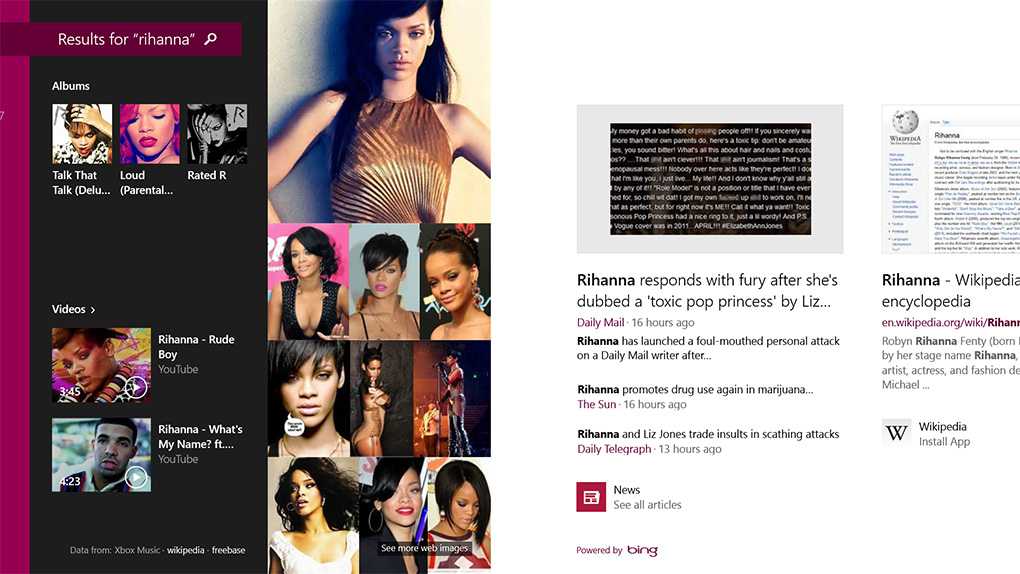 Perhaps the biggest change to search here is a new hero interface powered by Bing. If you search for an artist like Rihanna you’re presented with a full-screen interface that surfaces images, video, and audio content. It’s done so in a useful but stylish way and it will even retrieve data from applications. One particularly impressive part of this search interface is that it shows web links with a thumbnail preview of the site you’re about to click on. If you want to play audio from a particular artist then it jumps straight into Xbox Music, or it will find YouTube videos from the web that are relevant.