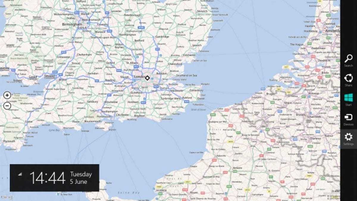 The five ‘charms’ that float in from the right will function differently depending on the app you’re running.