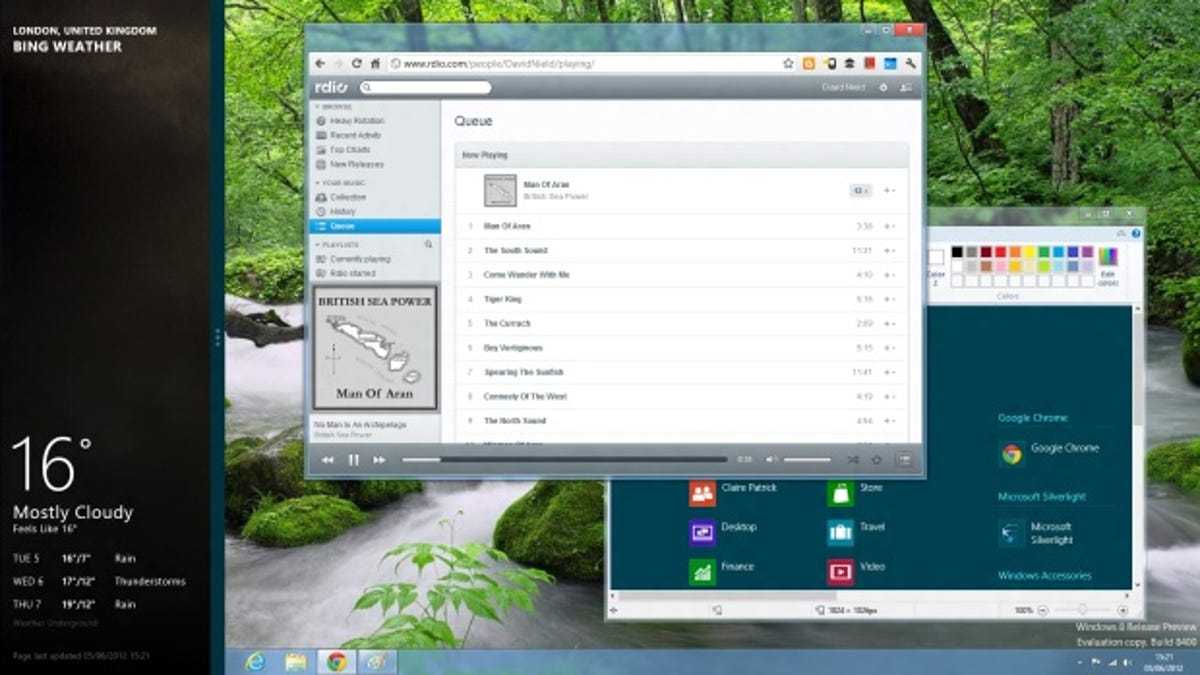 Two Metro apps can be run side-by-side, but the feature doesn’t work with desktop apps — with these programs you can use the window snapping tools carried over from Windows 7.