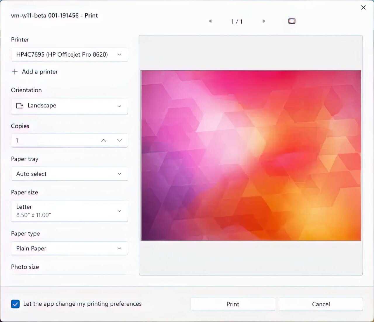 Кроме этого, диалоговое окно «Печать» получило обновлённый дизайн в стиле Windows 11. Более того, это окно теперь может автоматически находить сетевые принтеры. Если в выпадающем списке выбрать тот принтер, который никогда не использовался на компьютере, то Windows 11 установит драйверы и сделает первоначальную настройку устройства.