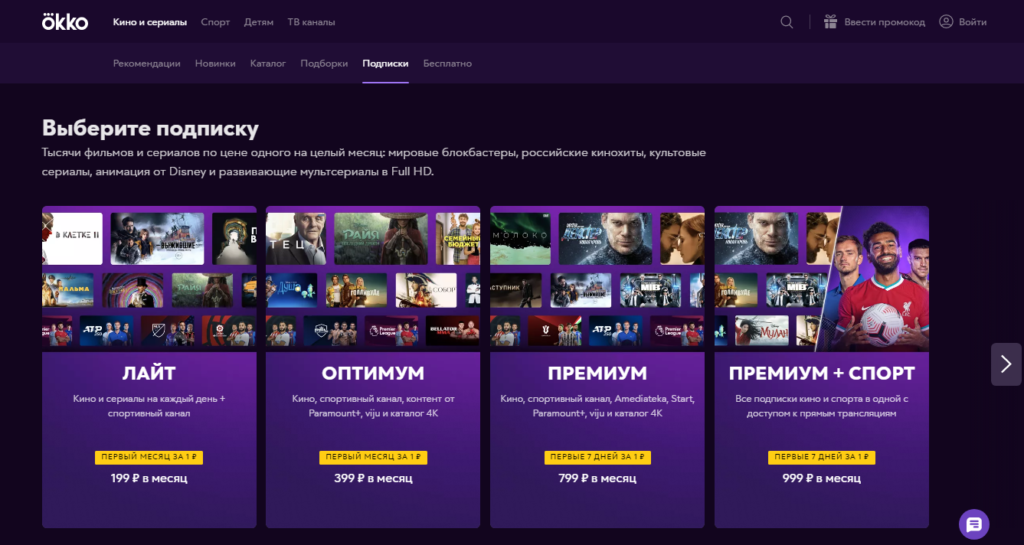 ОККО предлагает на выбор несколько вариантов подписки. Актуальный список платных сервисов смотрите на сайте okko.tv. Минимальный пакет на момент написания статьи стоит 199 рублей в месяц, максимальный «Премиум+спорт» 999 рублей.
