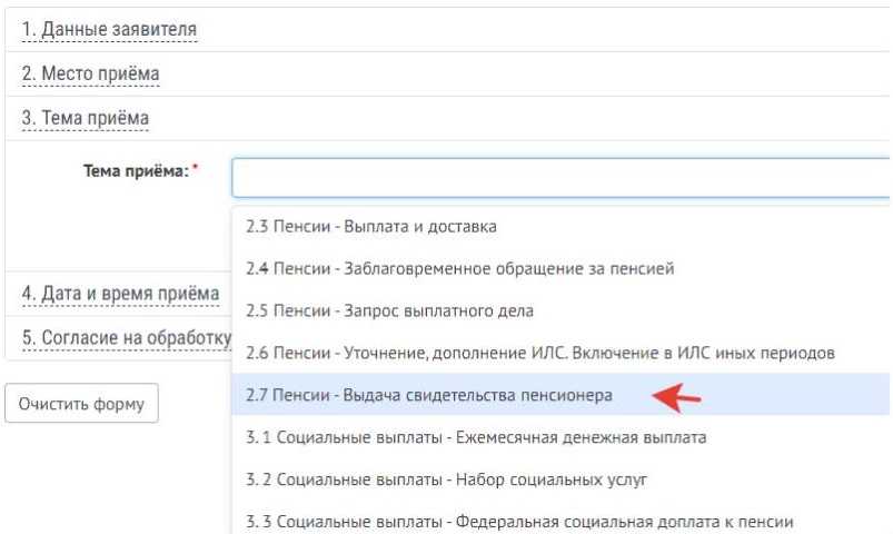 Шаг 4. Выбрать подходящее территориальное отделение фонда и тему приёма: «Выдача свидетельства пенсионера».