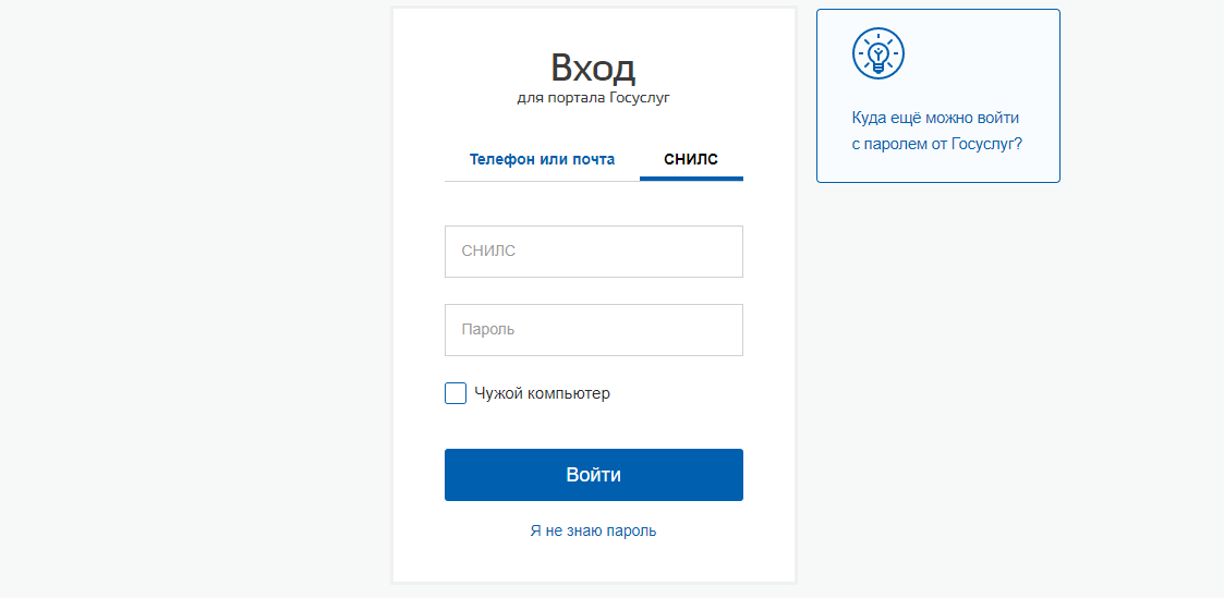 Чтобы выполнить вход по номеру СНИЛС, достаточно просто выбрать этот пункт в меню и ввести нужную информацию