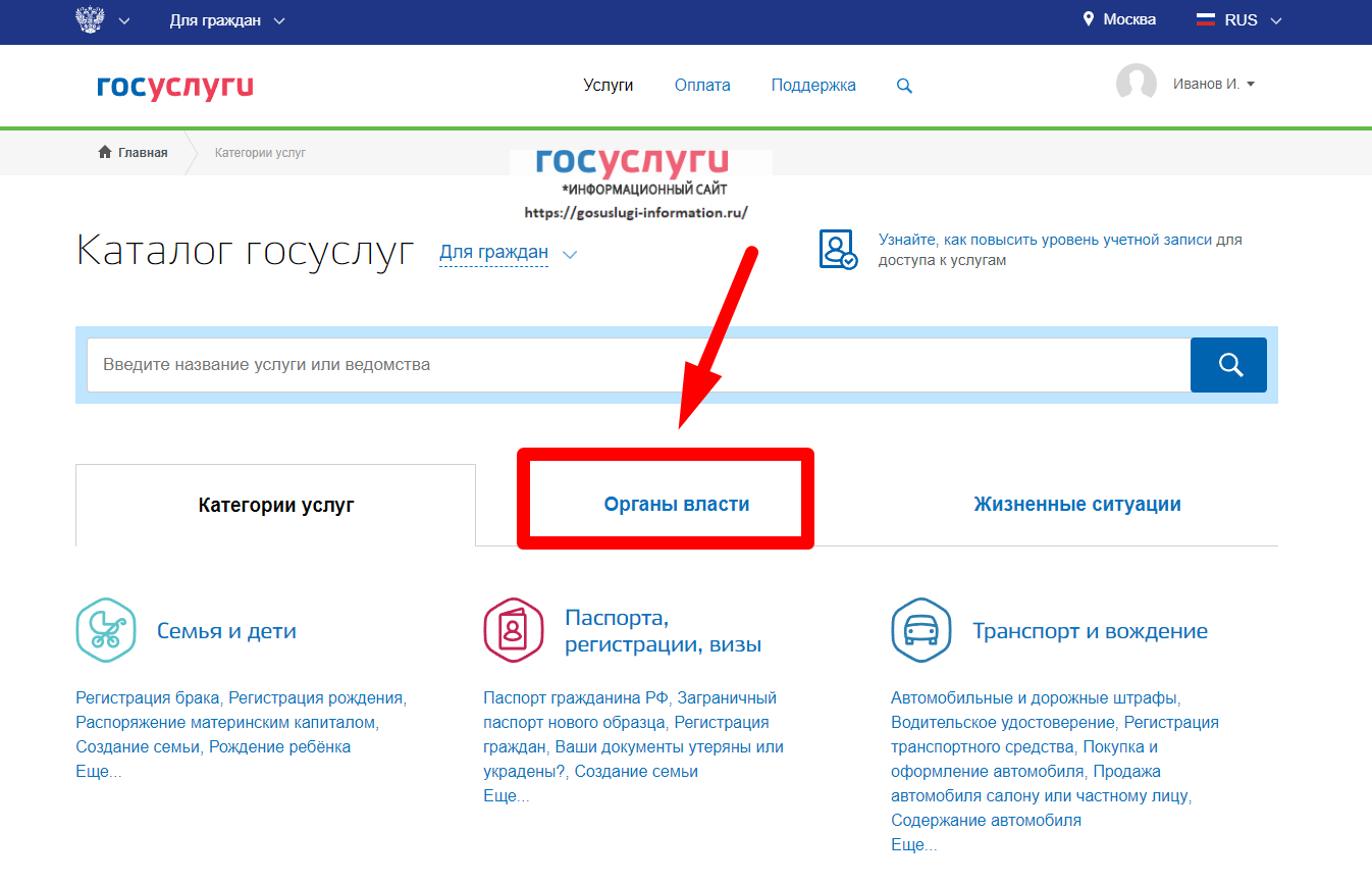 - Зайдите в раздел «Услуги» и выберите вкладку «Органы власти».