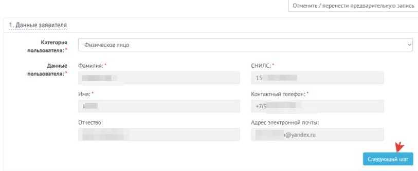 - Данные заявителя. Здесь выбираете в категории «физическое лицо», заполняете ФИО, СНИЛС и контактный телефон.