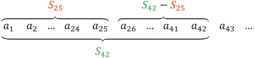 Формула, приведенная в предыдущем пункте, дает ответ на вопрос, как найти сумму арифметической прогрессии (первых элементов), но часто в задачах необходимо просуммировать ряд чисел, стоящих в середине прогрессии. Как это сделать?