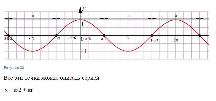 Запись «π/3+ 2πn» называется серией решений. Она включает в себя бесконечное количество значений х, которые обращают ур-ние в справедливое равенство. Достаточно выбрать любое целое число и подставить его в серию решений. Например, при n = 0 получим решение