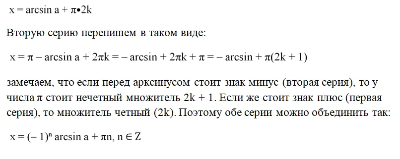 x= π — arcsin(a) + 2πk = -arcsin(a) + π(1 + 2k).
