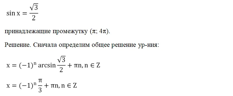 Решение: Воспользуемся определением, тогда решение запишется в виде: x= arcsin(3/5) + 2πk и x= π — arcsin(3/5) + 2πk.