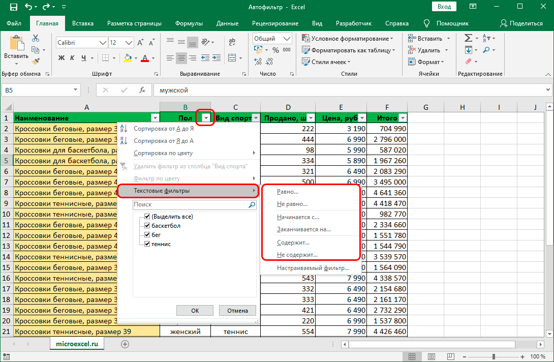 - При выборе опции Текстовые фильтры в контекстном меню можно отметить вариант фильтрации содержит. , начинается с… и др.