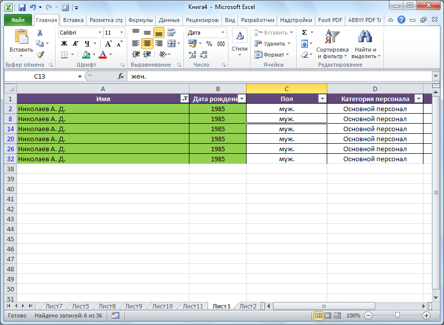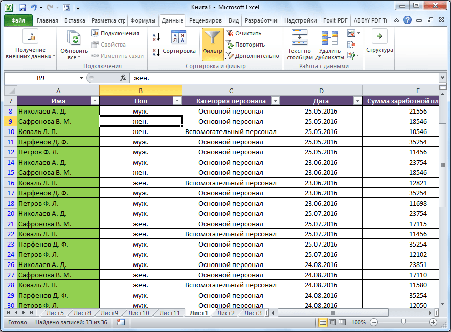 Если данные после фильтрации были изменены, фильтрация автоматически не срабатывает, поэтому необходимо запустить процедуру вновь, нажав на кнопку Повторить в группе Сортировка и фильтр на вкладке Данные.