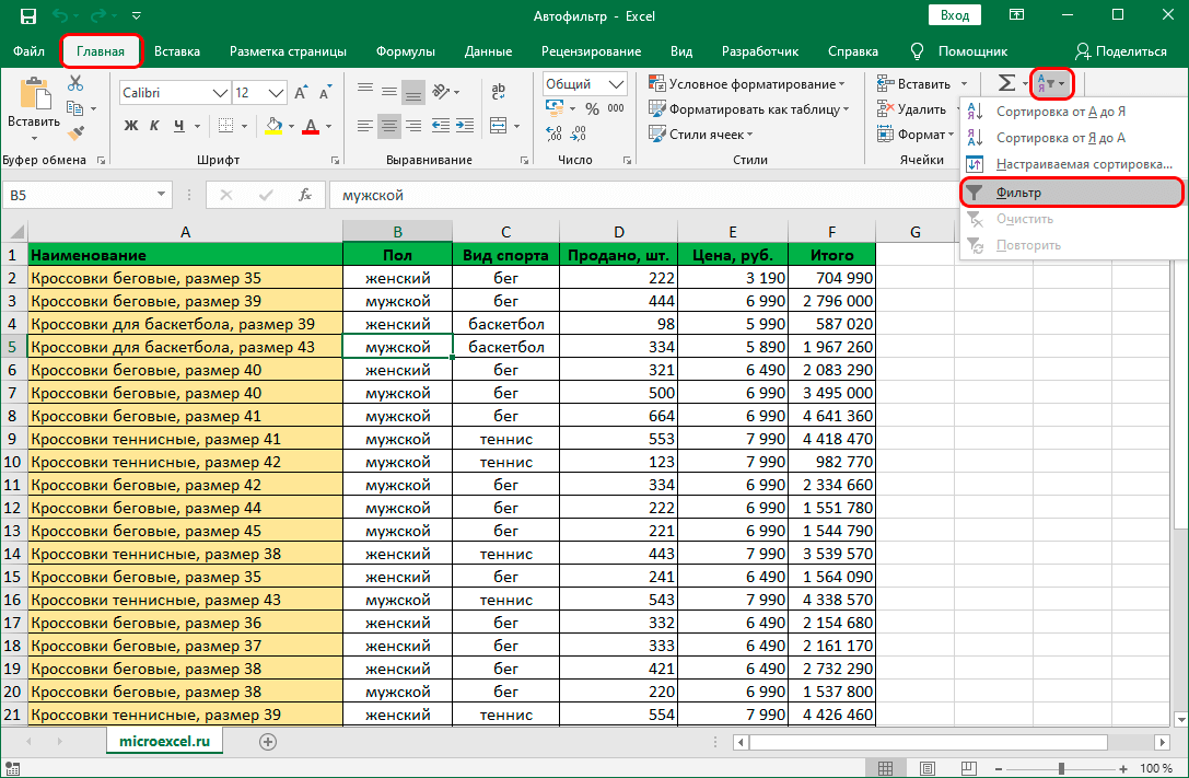 - Во вкладке “Главная” нажимаем на значок “Сортировка и фильтр”, в открывшемся списке кликаем по пункту “Фильтр”.