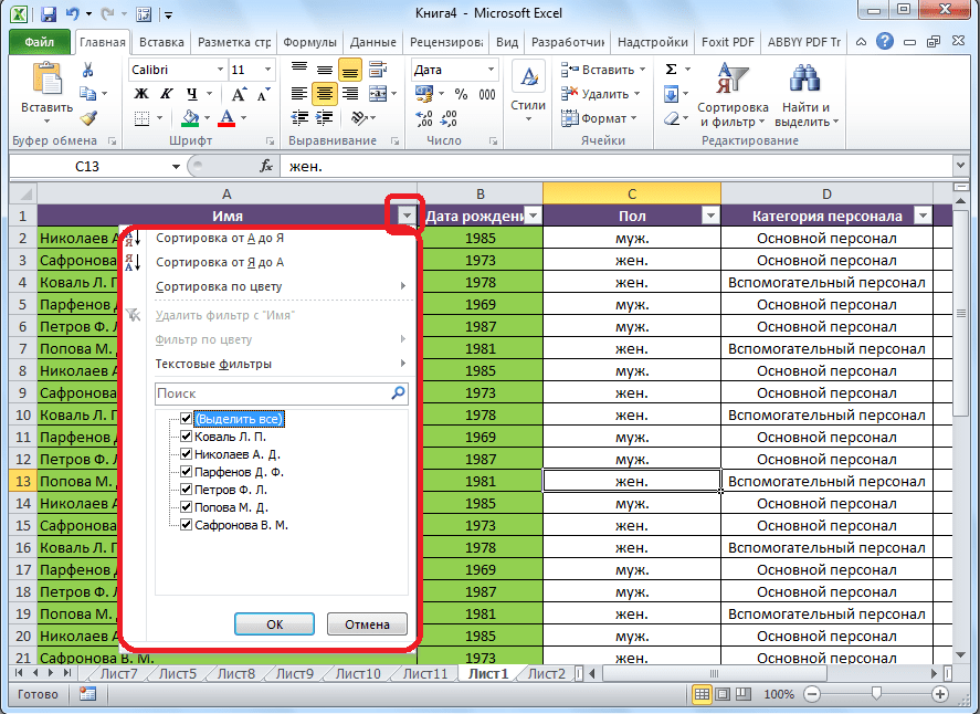 В случаях, когда столбец наполнен текстовыми значениями, то накладывание фильтра будет производиться следующим образом: