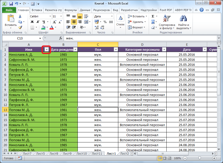 - Благодаря выполненным действиям мы смогли спрятать все лишние данные. Столбец, к которому применен фильтр достаточно легко определить визуально, так как внутри характерного квадрата появится изображение воронки рядом со стрелкой вниз.