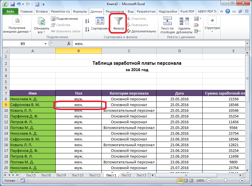 Кликаем по любой ячейке таблицы, после этого переключаемся во вкладку “Данные”, где нажимаем кнопку “Фильтр” (группа инструментов “Сортировка и фильтр”).