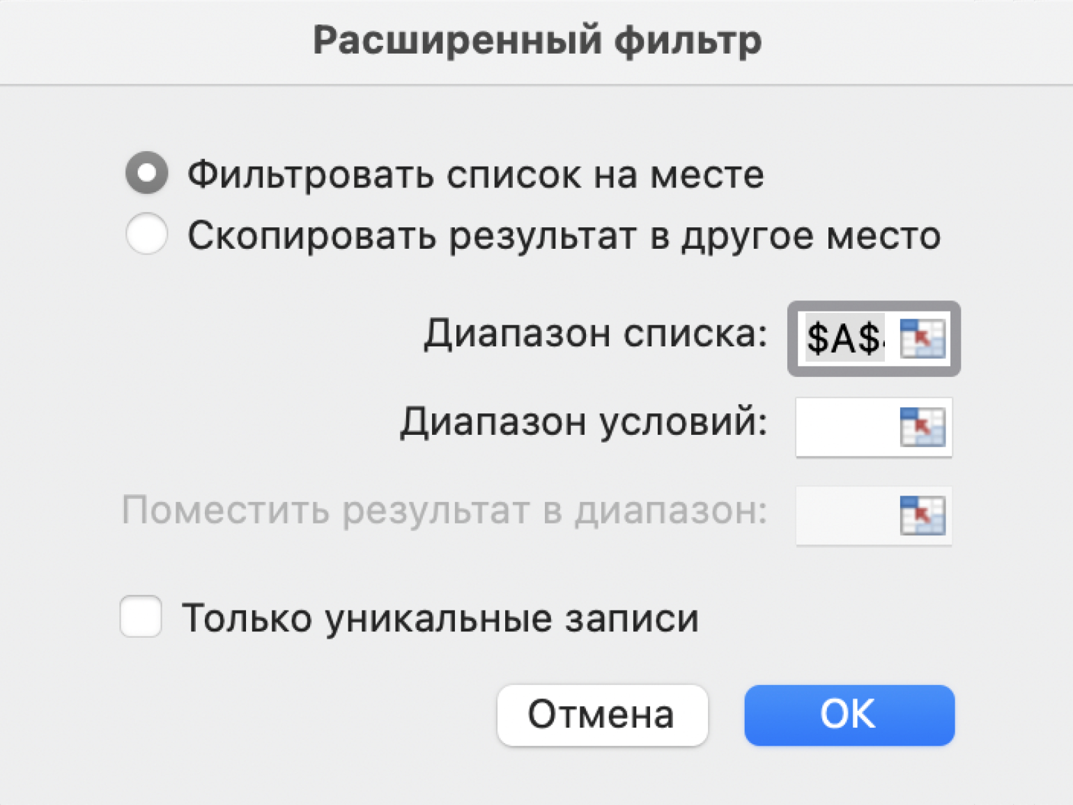 - Диапазон списка — диапазон таблицы, для которой нужно применить фильтр. Он заполнен автоматически, для этого мы выделяли ячейку исходной таблицы перед тем, как вызвать меню.