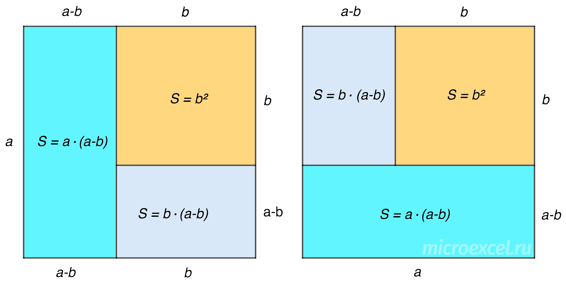 Раскрыв скобки с учетом правил арифметики получаем исходную формулу: (a-b)(a+b) = a 2 + ab – ba – b 2 = a 2 – b 2 .