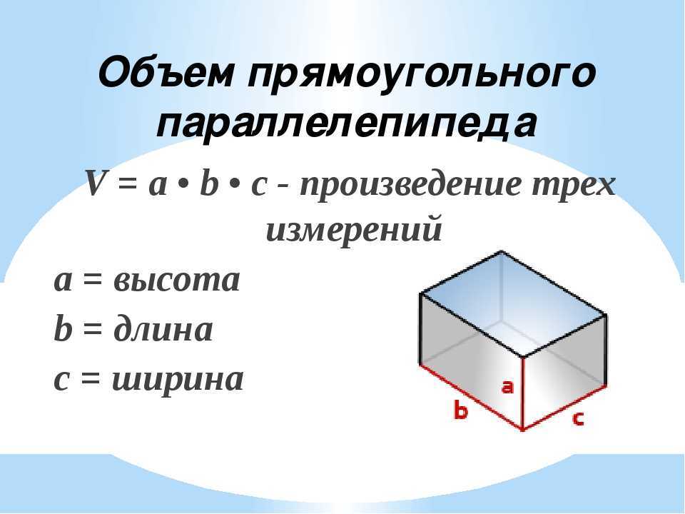 Объём параллелепипеда тоже легко найти. Надо просто перемножить длину, ширину и высоту.