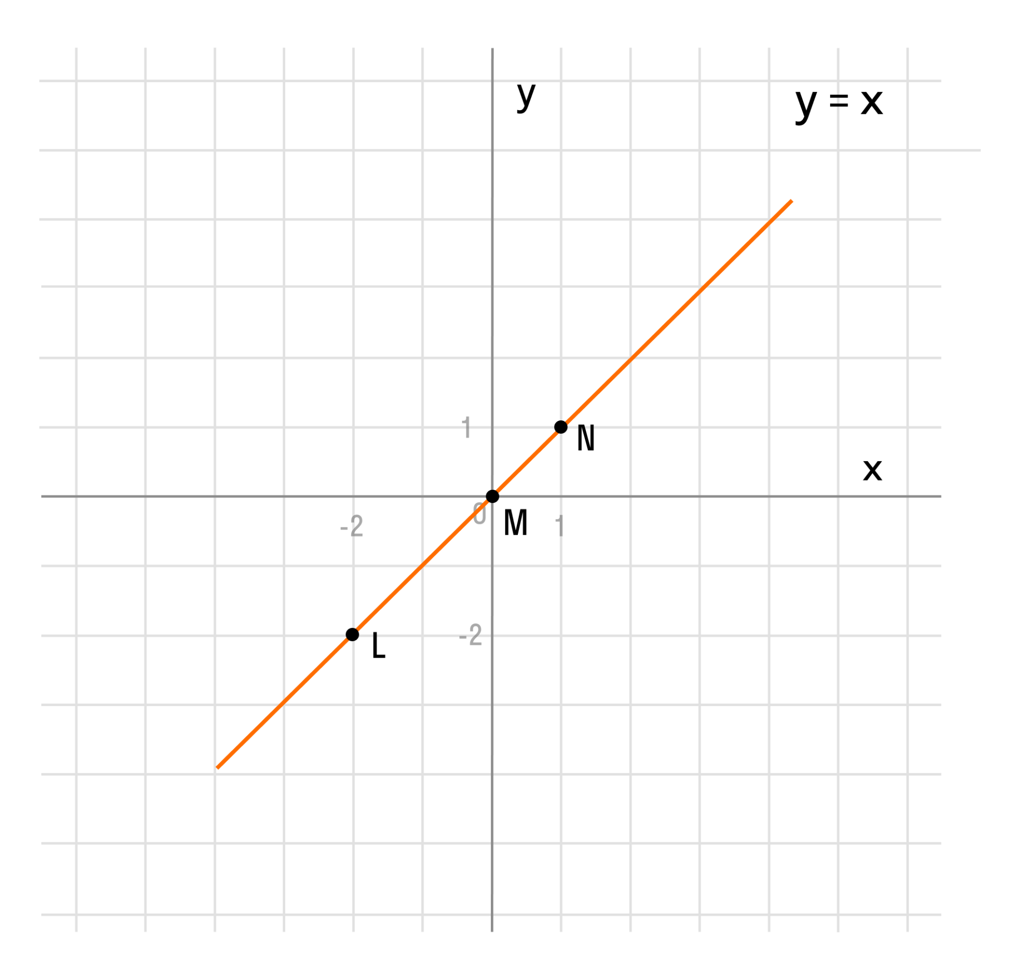 Отметьте на координатной плоскости любые три точки, например: L(-2;-2), M(0;0) и N(1;1).
