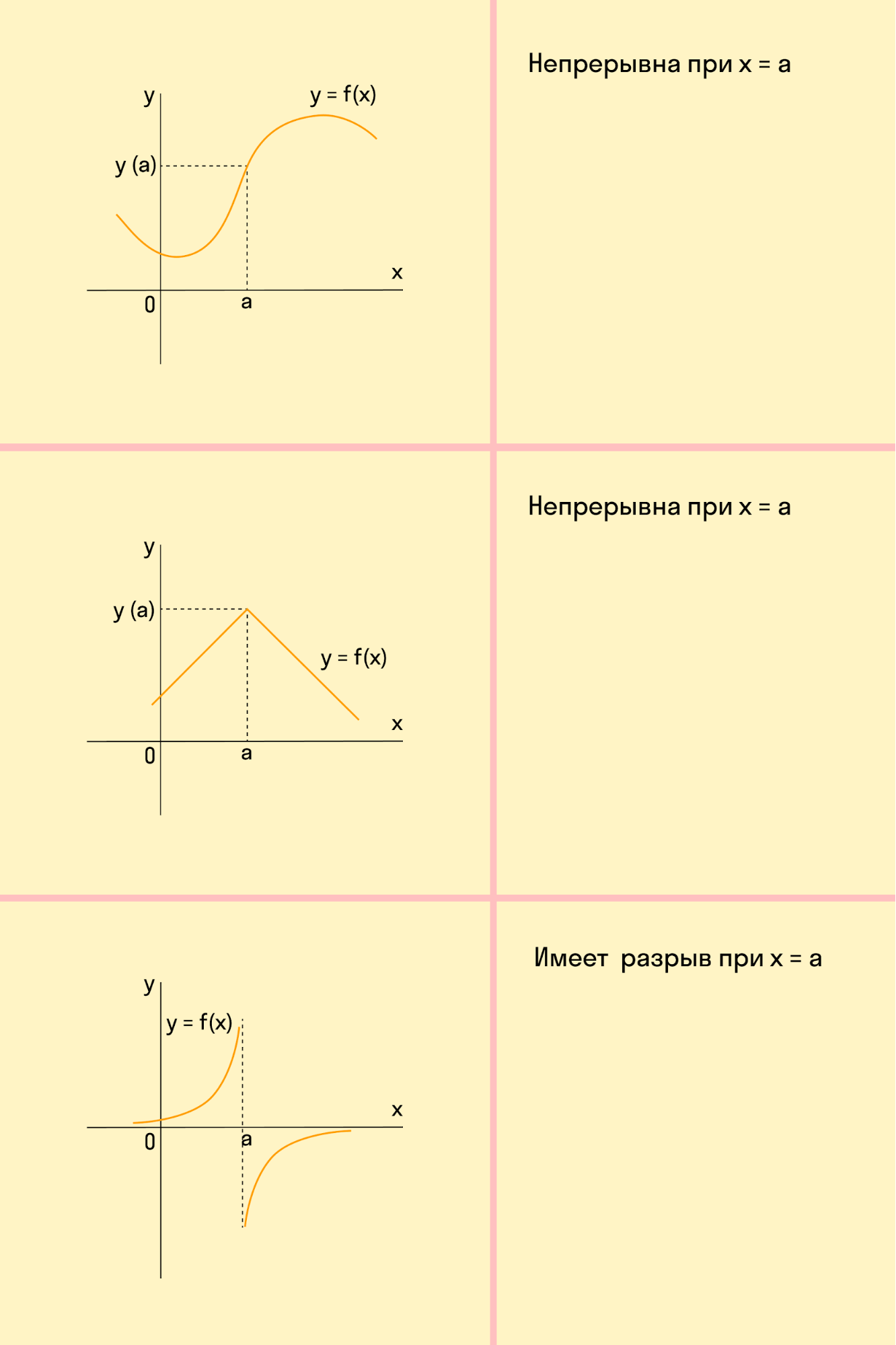 Если функция f(x) не является непрерывной в точке x = a, говорят, что f(x) имеет разрыв в этой точке.