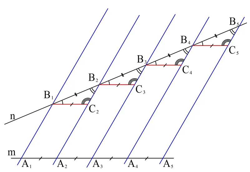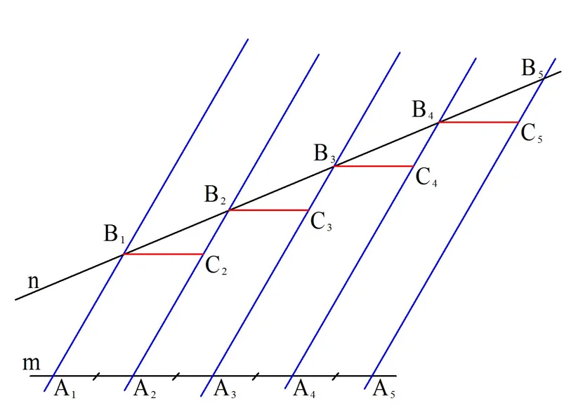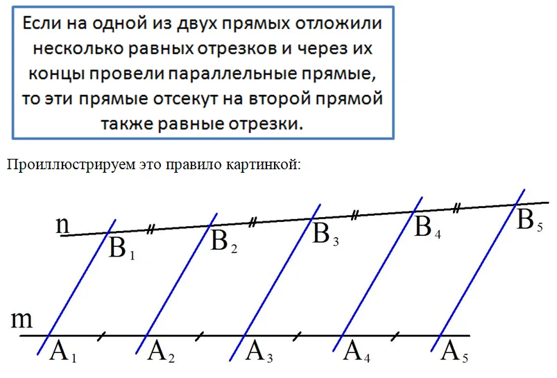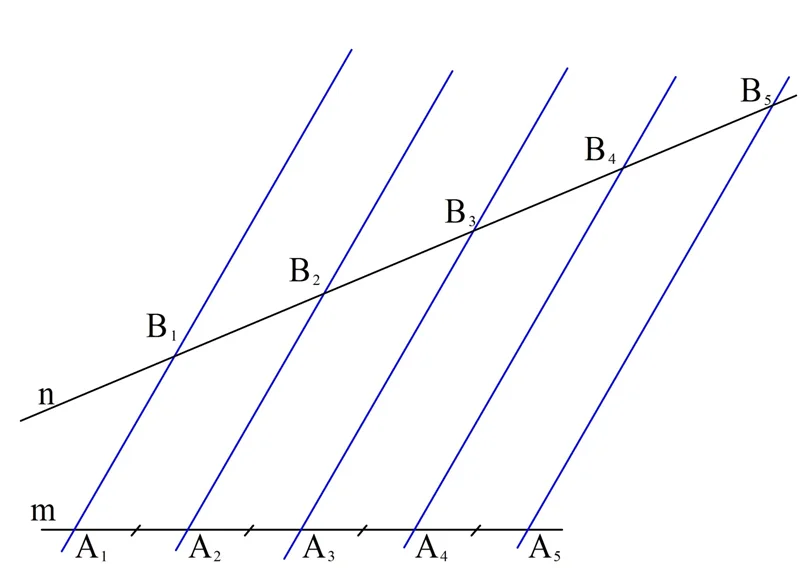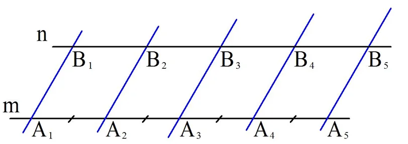 Далее через концы отрезков провели параллельные линии (показаны синим цветом), которые пересекли некоторую прямую n в точках В1, В2,В3 и т.д. Теорема утверждает, что получившиеся при этом отрезки равны между собой: