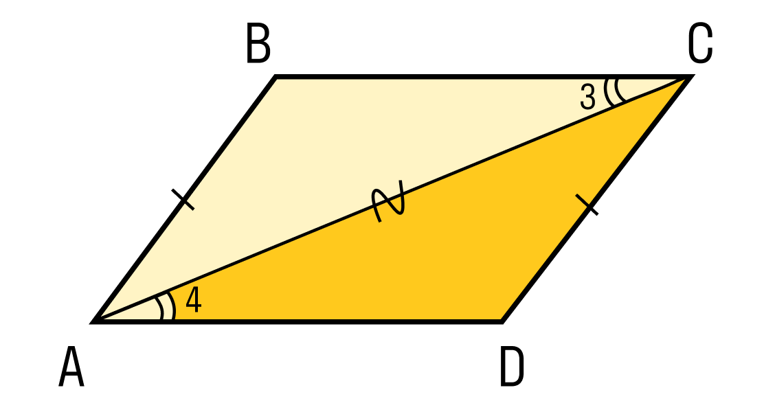 Диагональ АС разбивает фигуру на два треугольника ABC и ADC. АС — общая сторона двоих треугольников и САD эквивалентен АСВ также с САВ и АСD. Тогда ∆АВС = ∆СDA, по стороне и двумя прилегающими углами. Это значит, что АВ=СD, BC=AD и B=D, как соответствующие элементы в различных треугольниках.