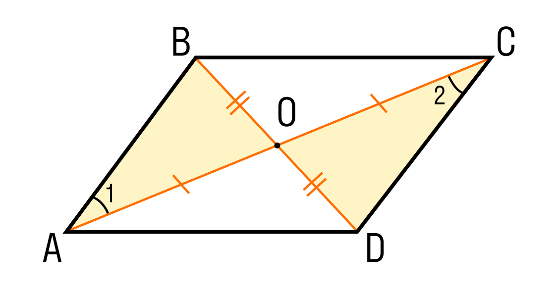 Шаг 1. Если диагонали четырехугольника ABCD делятся пополам точкой О, то треугольник АОВ равен треугольнику COD по двум сторонам и углу между ними: