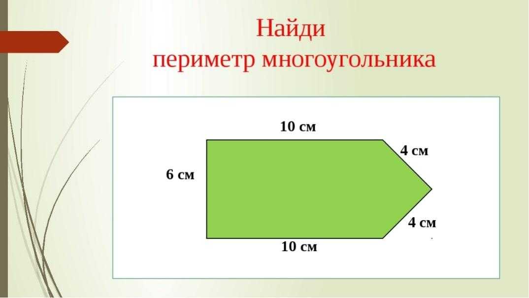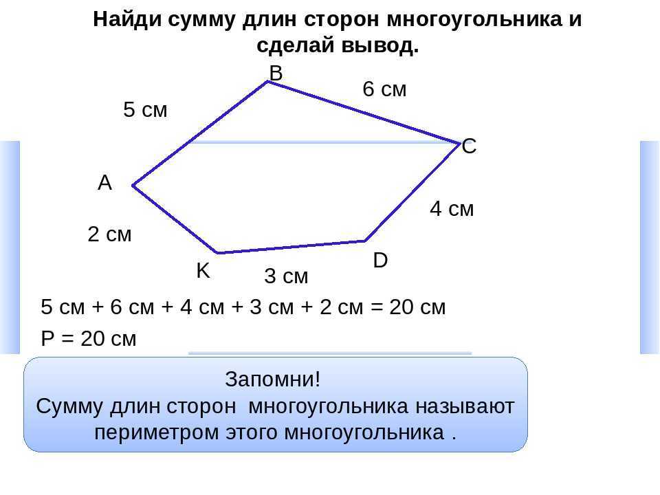 3. Найти периметр сложением длин всех сторон по формуле для неправильного многоугольника: P=a+b+c+d…, где a,b,c,d… — длины сторон. А если получился правильный: P=a×n, где a — длина стороны, а n — количество сторон фигуры.