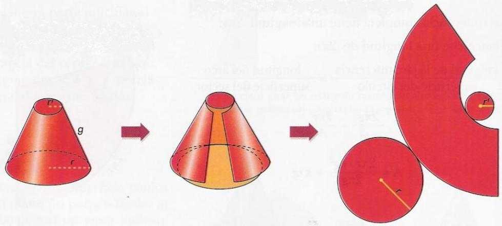 Как отмечалось, состоит поверхность фигуры из трех частей. Если отрезать каждое из оснований от фигуры, а затем вдоль образующей разрезать и развернуть боковую поверхность, то мы получим развертку усеченного конуса. Рисунок ниже показывает, как она выглядит.