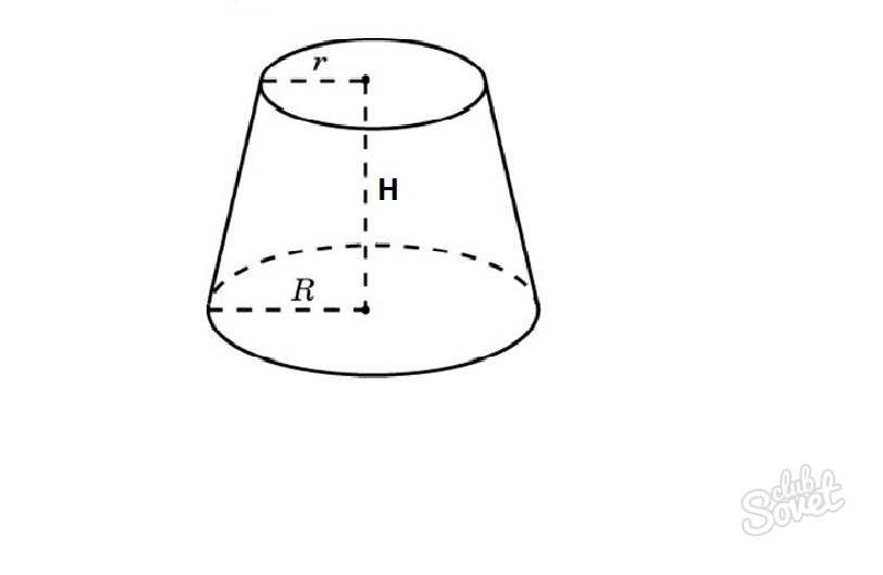 где:V — объем конусаh — высота конусаR — радиус нижнего основанияr — радиус верхнего основания