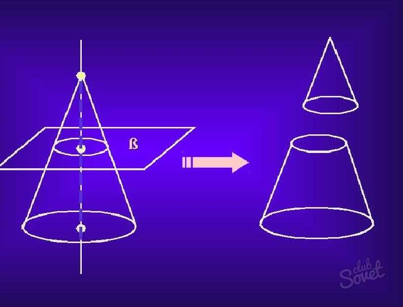В первом случае необходимо взять коническую фигуру и режущую плоскость, которая будет параллельна основанию. После этого с помощью плоскости следует отсечь верхнюю часть конуса. Оставшаяся под плоскостью фигура будет усеченной