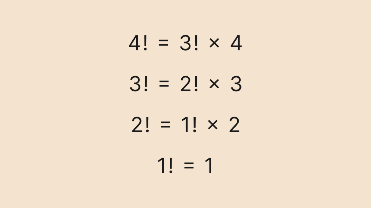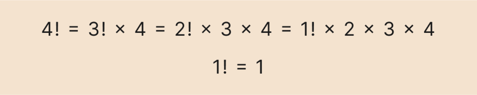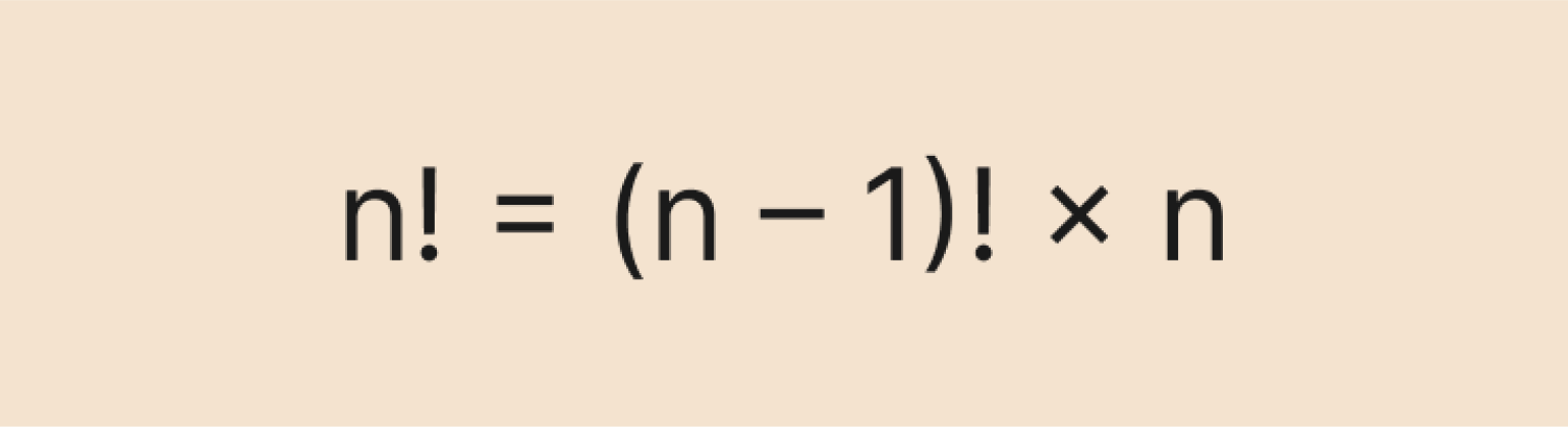 Так как факториал — это произведение всех натуральных чисел от до включительно, то можно вывести рекуррентную формулу.