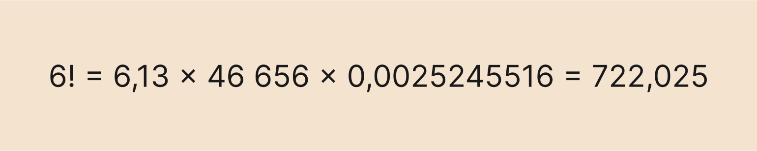 Получили приближённое значение настоящего факториала, который равен 720. Но можно сделать ответ и более точным. Для этого нужно добавить больше знаков после запятой всем переменным — например, если взять 20 знаков, то ответ будет таким:
