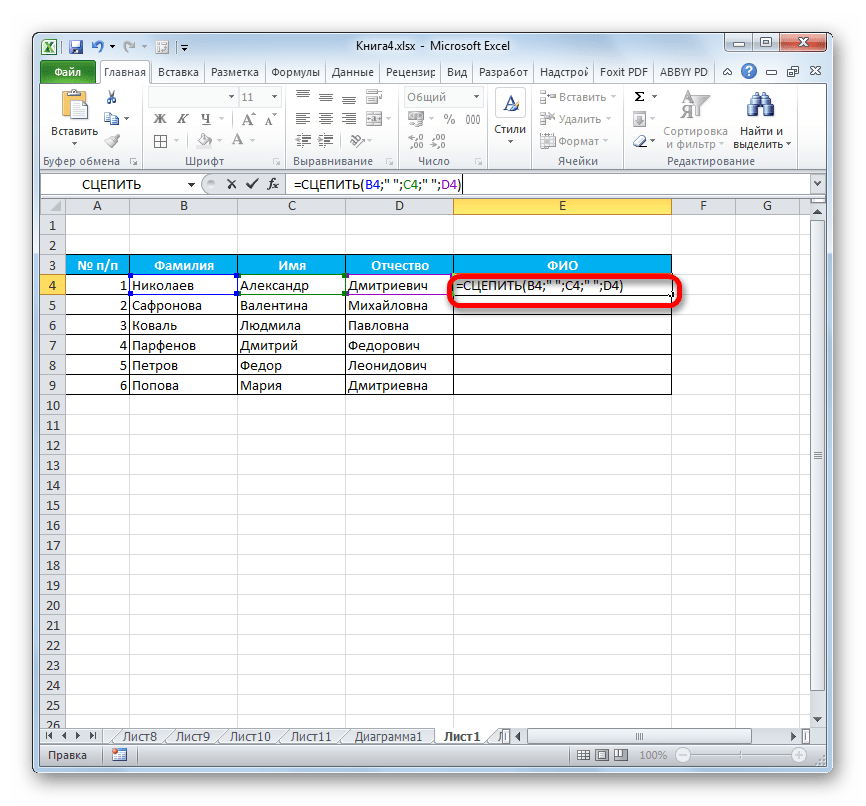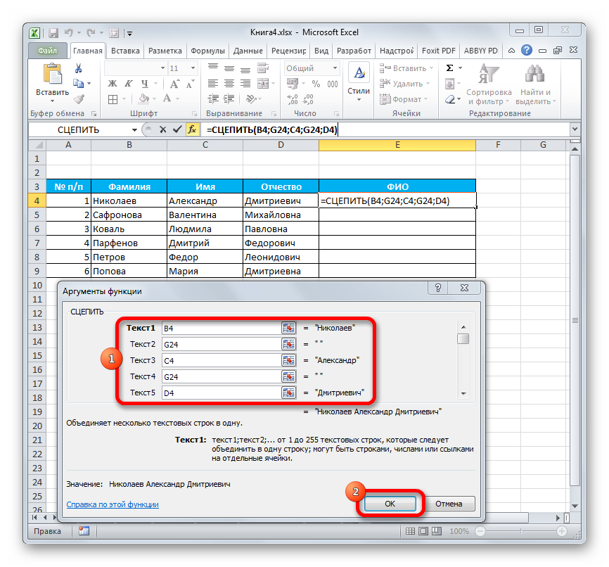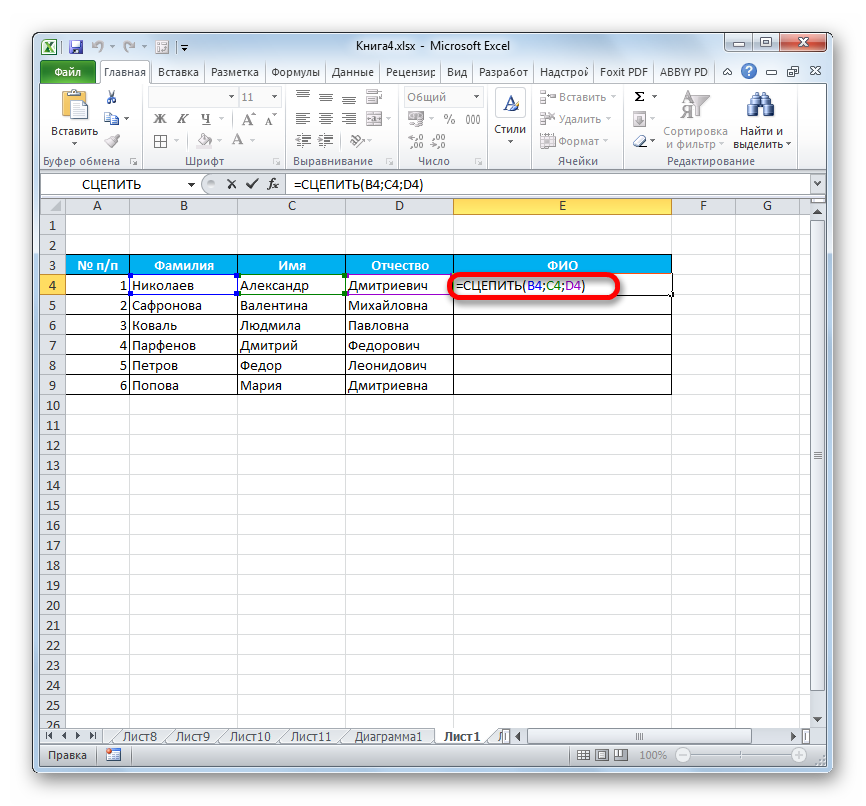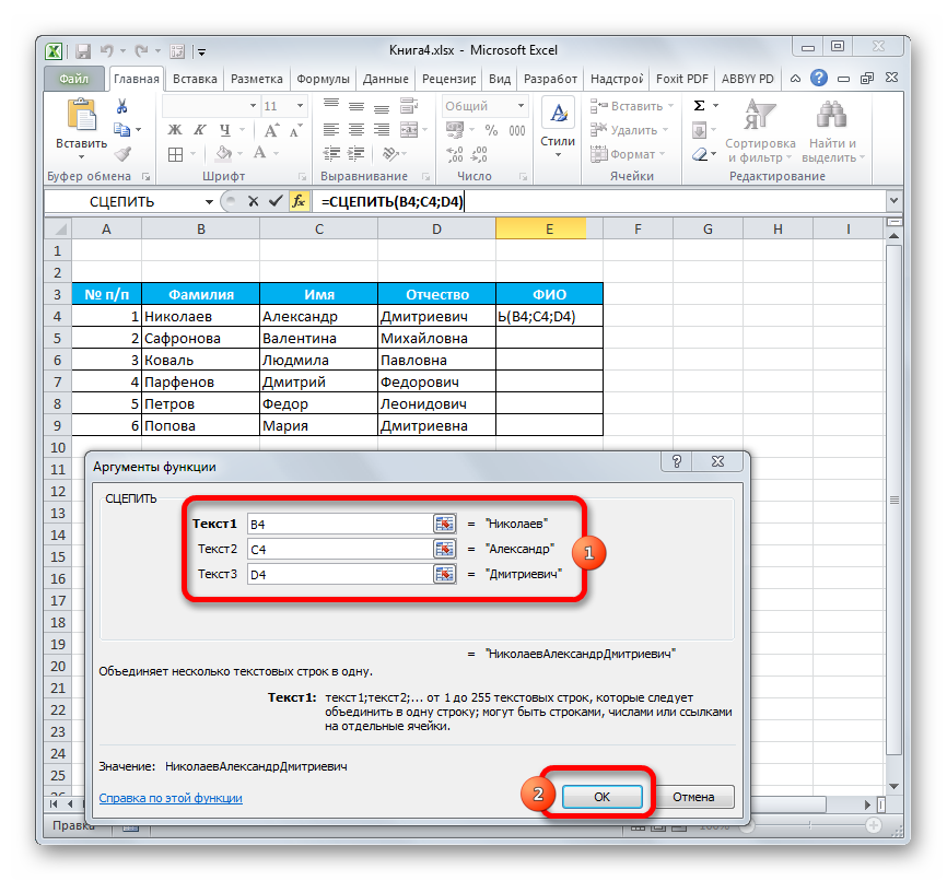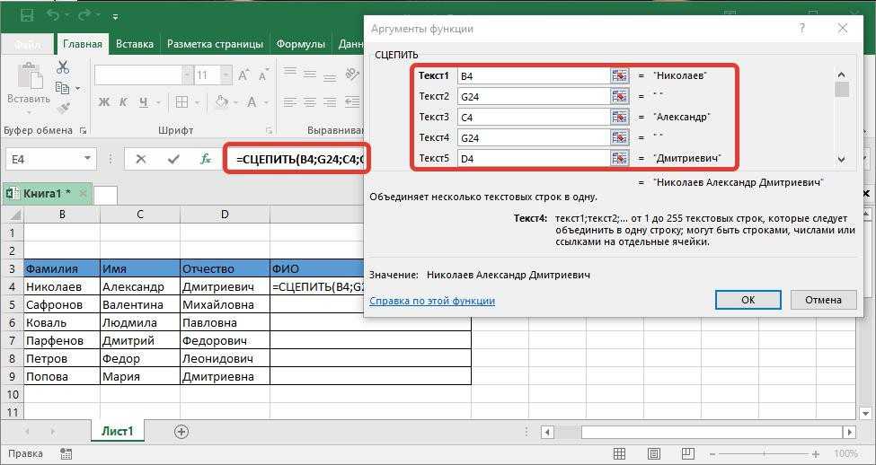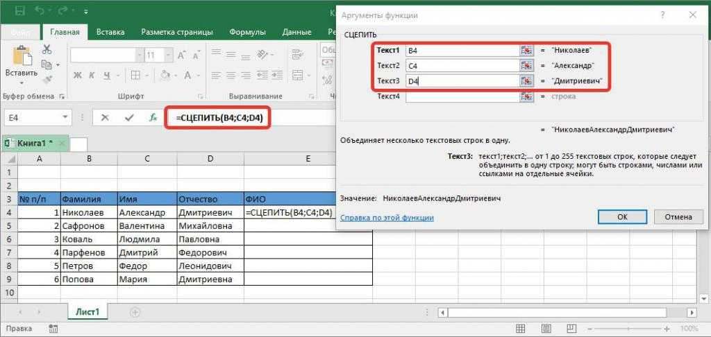 После этого, согласно синтаксису, ставим точку с запятой ; — этот символ служит разделителем. Повторяем предыдущий шаг для столбцов с отчеством и фамилией. В конце закрываем функцию с помощью закрывающей скобки ).
