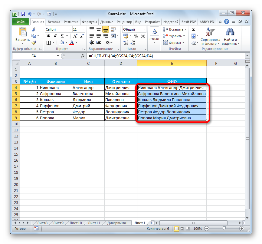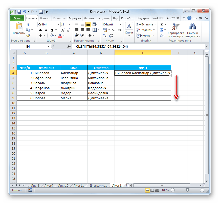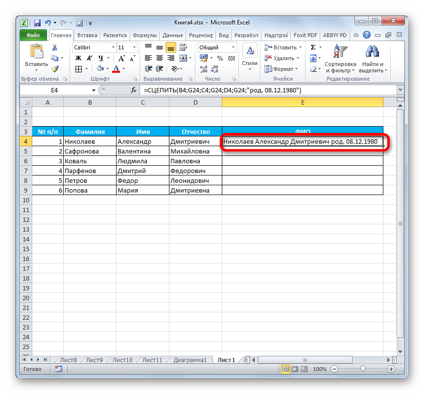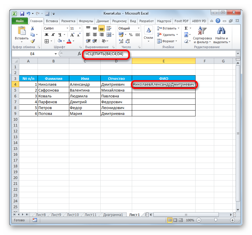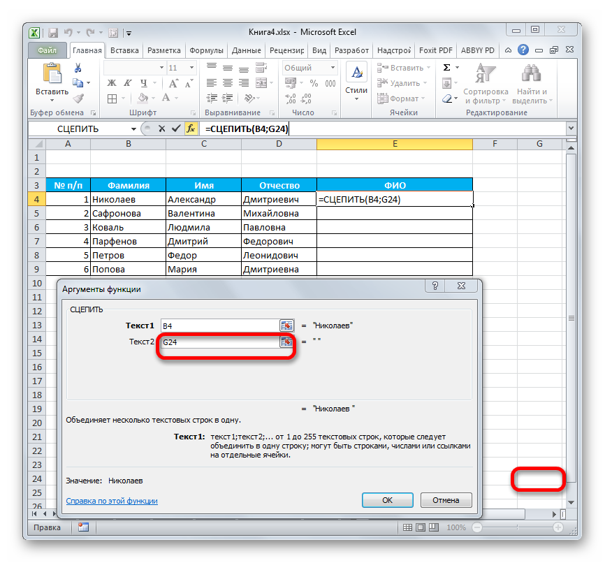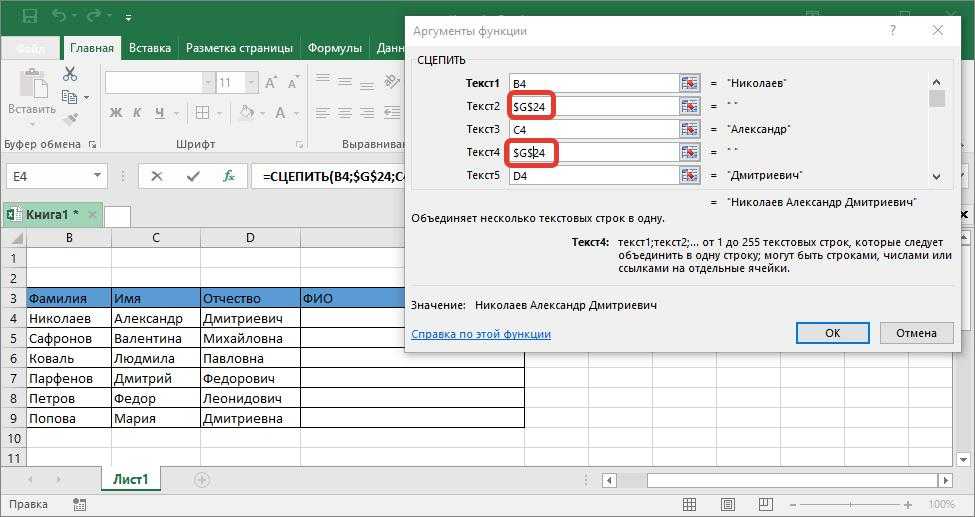 После этого, согласно синтаксису, ставим точку с запятой ; — этот символ служит разделителем. Повторяем предыдущий шаг для столбцов с отчеством и фамилией. В конце закрываем функцию с помощью закрывающей скобки ).
