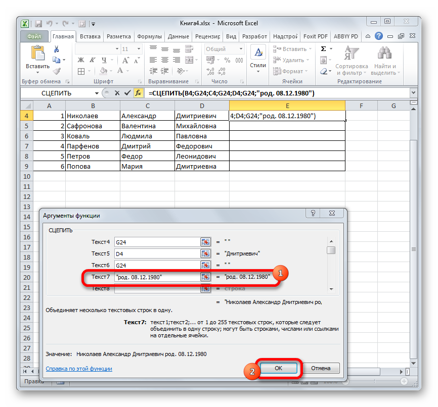 Работа с функцией СЦЕПИТЬ в Microsoft Excel