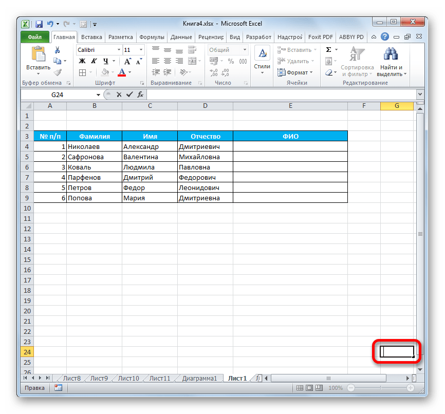 - одно целое полеНаведите курсор на ее а теперь давайте ячейку с фамилией