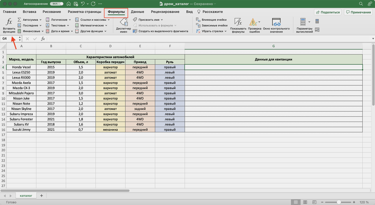 Второй способ — нажать на «fx» в строке ссылок на любой вкладке таблицы.