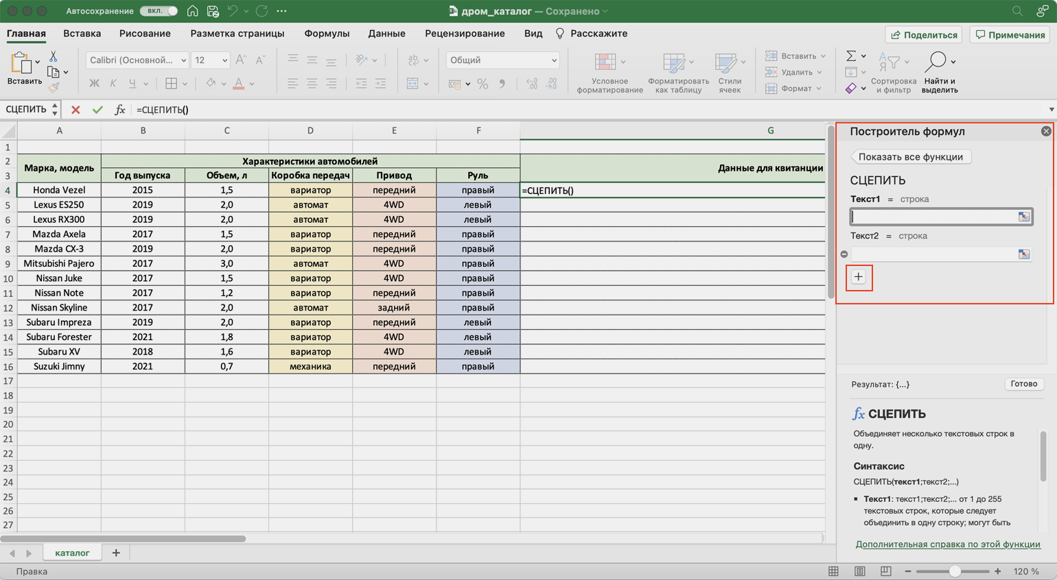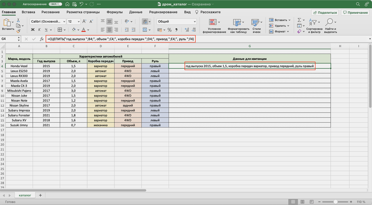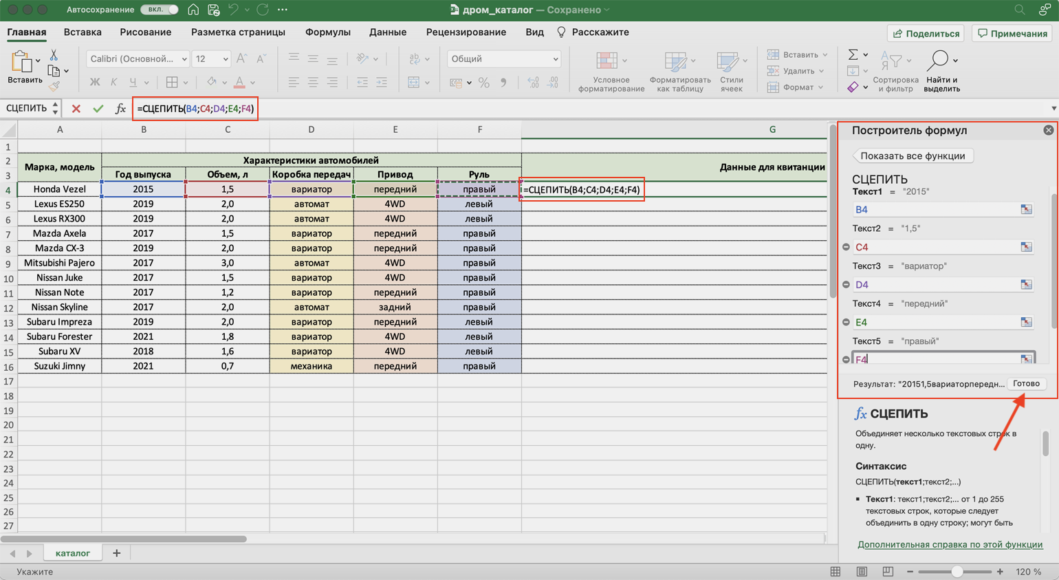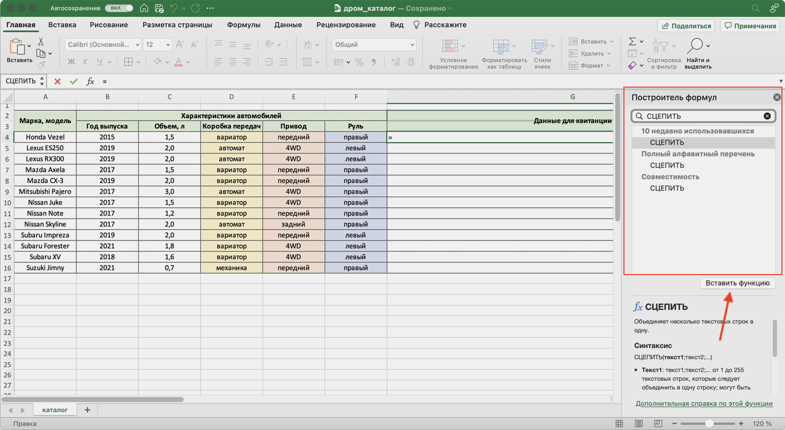 Для нашего примера можно преобразовать функцию к такому виду: fx=СЦЕПИТЬ(«год выпуска «;B4;», объем «;C4;», коробка передач «;D4;», привод «;E4;», руль «;F4). Главное — не забывать указывать все необходимые пробелы, которые должны быть между объединёнными данными.