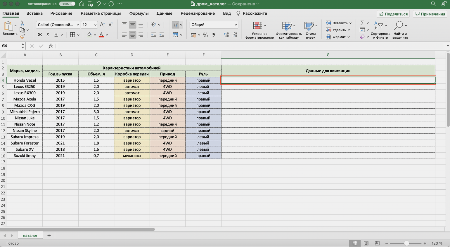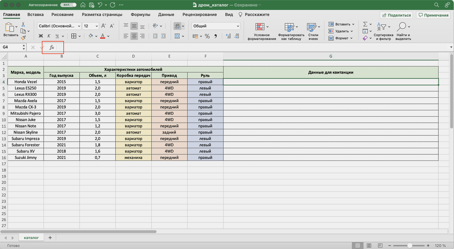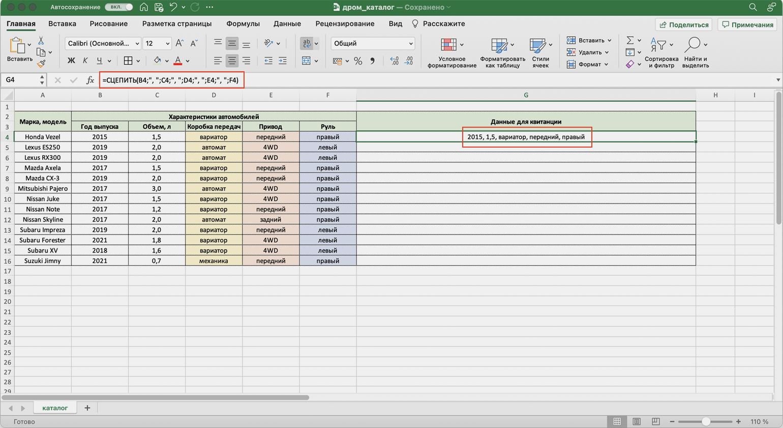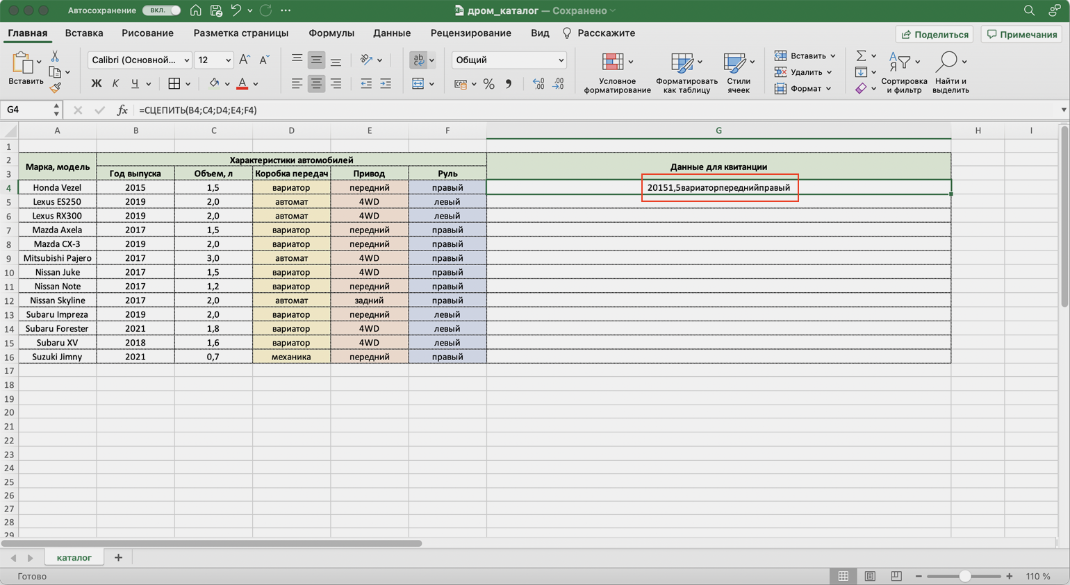Для нашего примера можно преобразовать функцию к такому виду: fx=СЦЕПИТЬ(«год выпуска «;B4;», объем «;C4;», коробка передач «;D4;», привод «;E4;», руль «;F4). Главное — не забывать указывать все необходимые пробелы, которые должны быть между объединёнными данными.