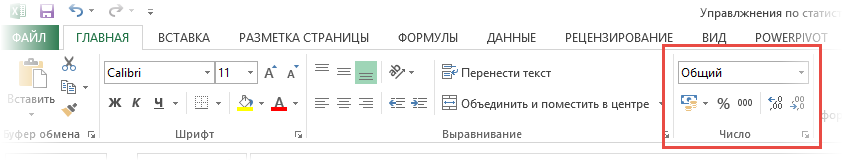 - Выделите нужную область значений, а затем перейдите во вкладку «Главная». Здесь вам необходимо найти категорию «Число» и кликнуть на небольшой треугольник рядом с полем формата (по умолчанию выставлен «Общий»).