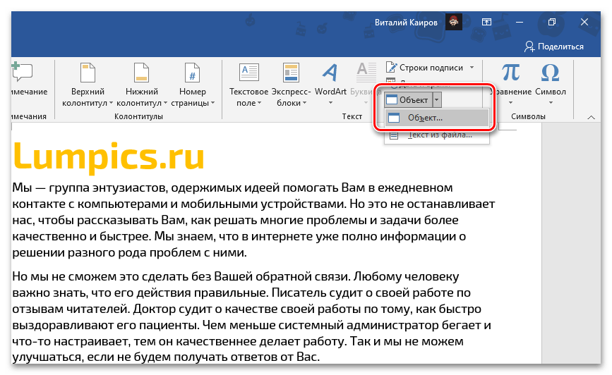 Первым делом открываю “Основной” файл, и ниже “статичного” текста который у меня меняться не будет, ставлю курсор на новую строку. Перехожу на панель “Вставка”, и в группе “Текст” нахожу кнопку “Объект”. Здесь в выпадающем меню выбираю “Объект“.
